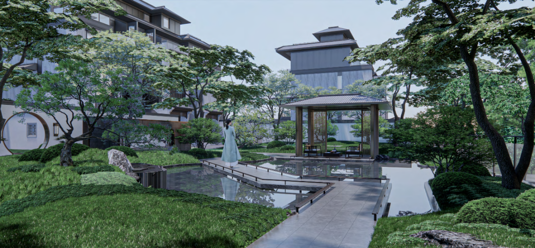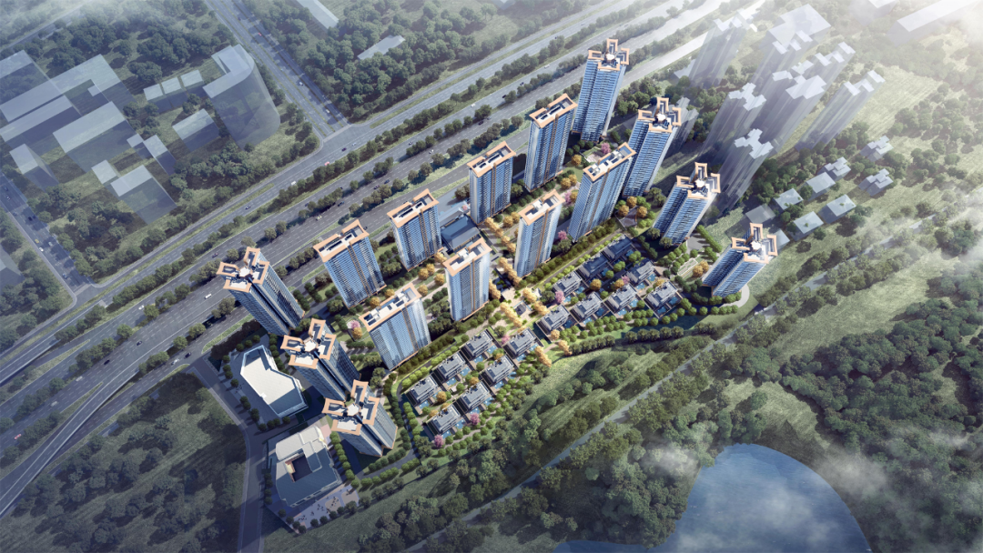 在大師團隊的妙筆下,整個項目規(guī)劃建設7棟塔樓、8棟板樓、15棟疊墅,高層圍繞南面的黑白面將軍山和南屏水庫形成為圍合之勢,將面寬1000m的湖景和5000m的山景資源最大化,實現建筑與外部環(huán)境的融合協(xié)調。