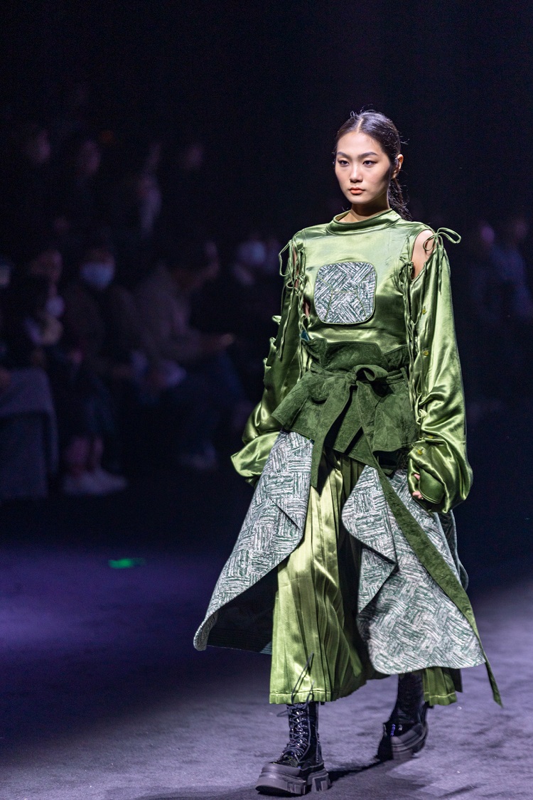 HUANG GANG品牌設(shè)計(jì)師黃剛堅(jiān)持“非遺+科技+時(shí)尚”的設(shè)計(jì)理念,以可持續(xù)時(shí)尚發(fā)展為核心進(jìn)行設(shè)計(jì)創(chuàng)造,“這次帶來的作品不僅運(yùn)用了全球領(lǐng)先的3D針織技術(shù),還選用了獲GOTS認(rèn)證的有機(jī)棉、麻、絲、生態(tài)再生羊絨,以及獲GRS認(rèn)證的再生聚醋纖維等面料和紗線?!蓖ㄟ^與中國傳統(tǒng)面料香云紗、壯錦等材料相結(jié)合進(jìn)行設(shè)計(jì)創(chuàng)作,他也不斷傳達(dá)出自身對(duì)非遺文化的由衷熱愛。