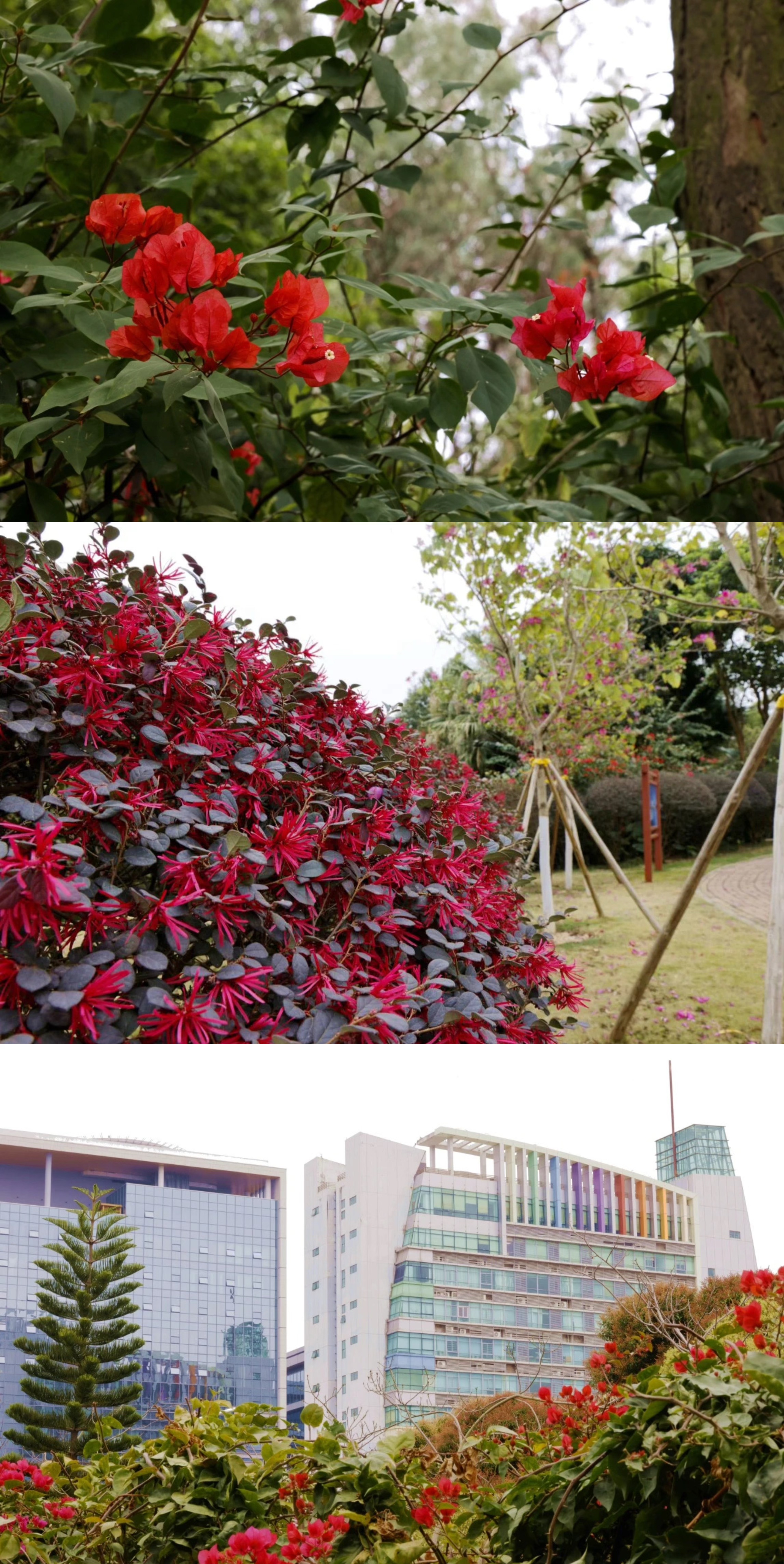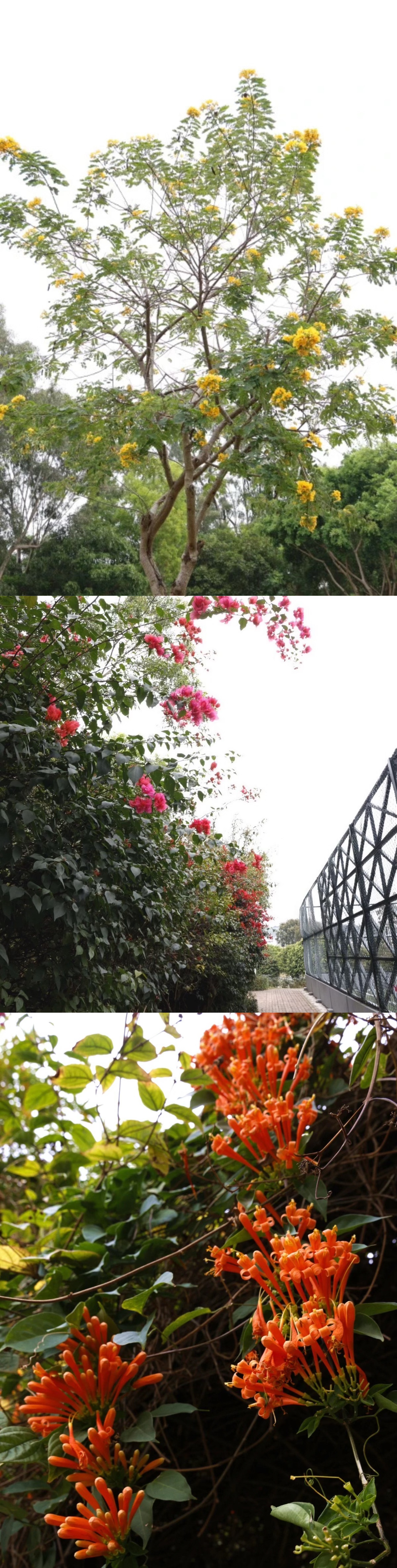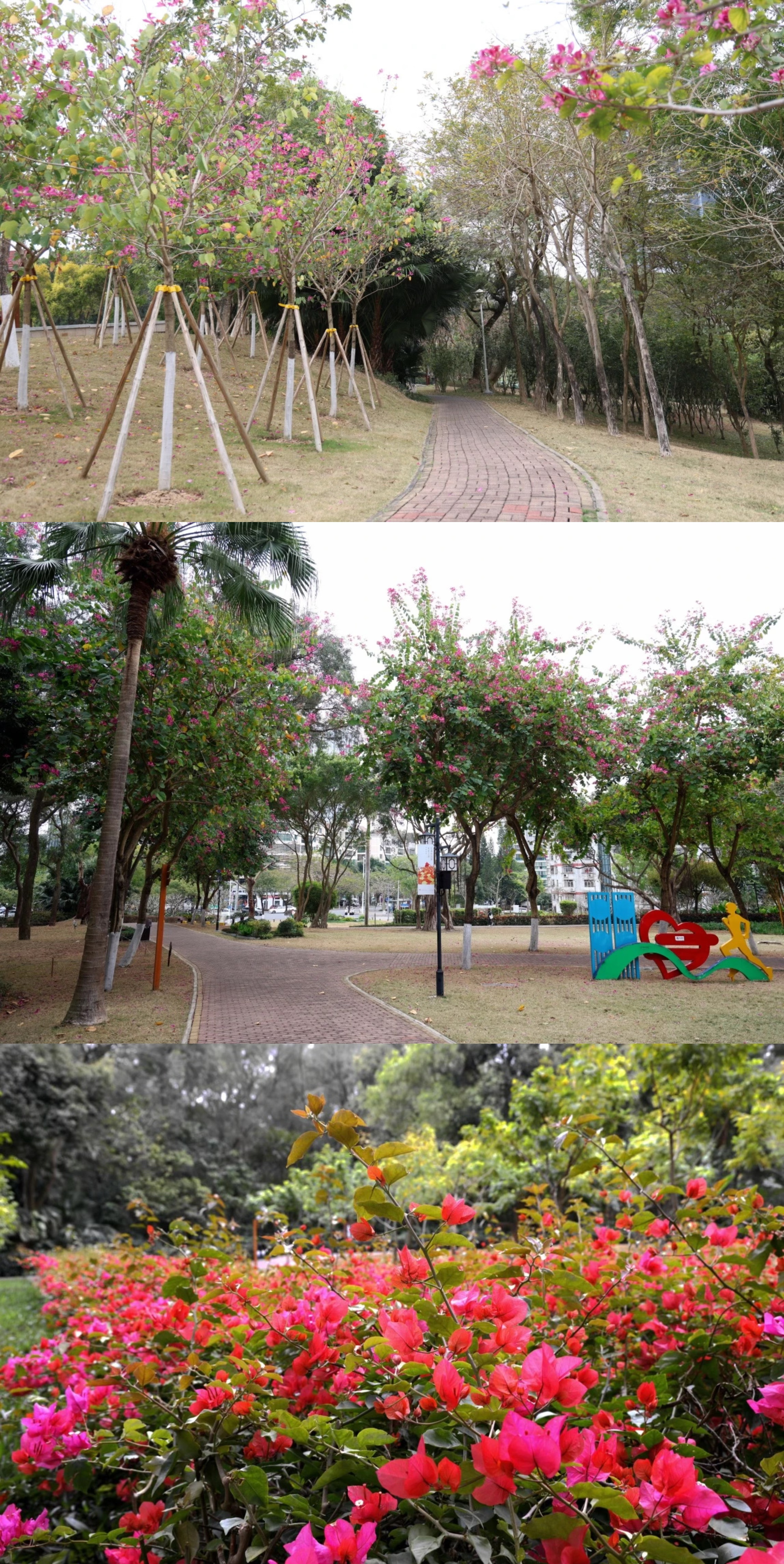 炮仗花、紅花紫荊、宮粉紫荊、木棉、火焰木、勒杜鵑、鳳凰木、黃槐、紫羅蘭……有的正值花期,有的含苞待放,盎然的春意將公園點(diǎn)綴得五彩斑斕。