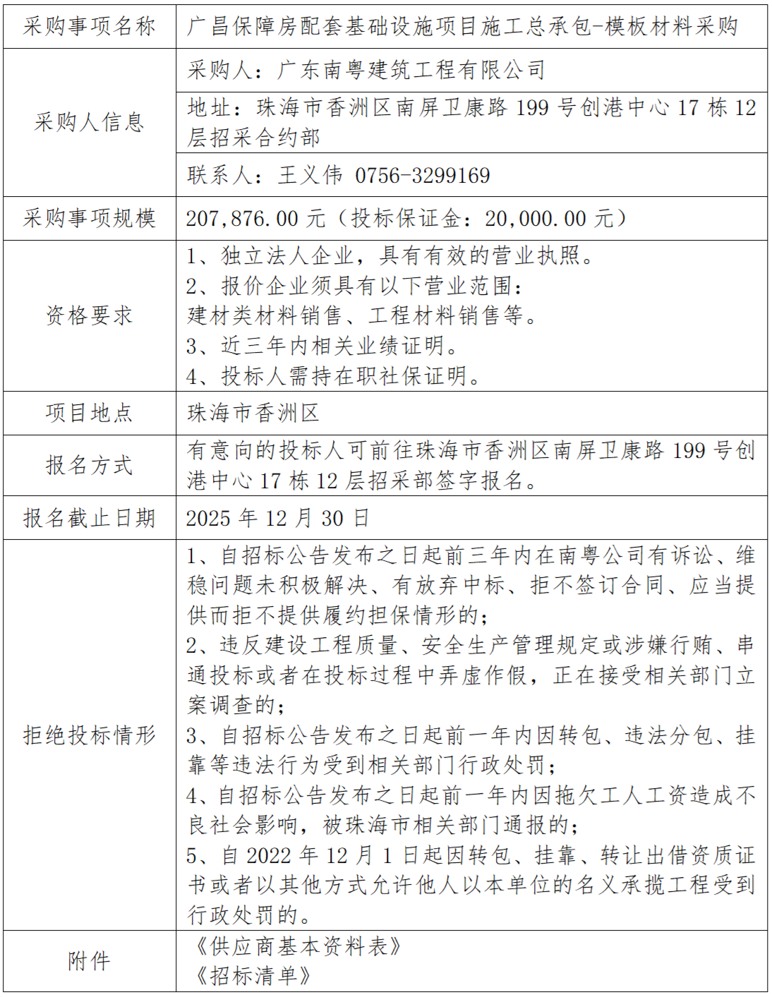 廣昌保障房配套基礎(chǔ)設(shè)施項(xiàng)目施工總承包-模板材料采購(gòu) 專欄:工程招標(biāo) 發(fā)布日期: 2025-12-24 作者:招采管理中心 附件:供應(yīng)商基本資料表 附件:廣昌保障房配套基礎(chǔ)設(shè)施項(xiàng)目施工總承包-模板材料采購(gòu)招標(biāo)清單 返回列表 上一篇:廣昌保障房配套基礎(chǔ)設(shè)施項(xiàng)目施工總承包--交通、安監(jiān)工程專業(yè)分包(第二次) 下一篇:廣昌保障房配套基礎(chǔ)設(shè)施項(xiàng)目施工總承包--交通、安監(jiān)工程專業(yè)分包