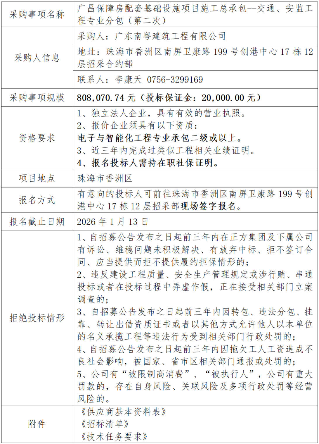 廣昌保障房配套基礎(chǔ)設(shè)施項目施工總承包--交通、安監(jiān)工程專業(yè)分包(第二次) 專欄:工程招標 發(fā)布日期: 2026-01-08 作者:招采管理中心 附件:供應(yīng)商基本資料表 附件:廣昌保障房配套基礎(chǔ)設(shè)施項目施工總承包-交通、安監(jiān)專業(yè)分包招標預(yù)算價清單 - 空白清單 附件:招標技術(shù)要求(交通安監(jiān)工程) 返回列表 上一篇:廣昌保障房配套基礎(chǔ)設(shè)施項目施工總承包-食堂服務(wù)(第二次) 下一篇:廣昌保障房配套基礎(chǔ)設(shè)施項目施工總承包-模板材料采購